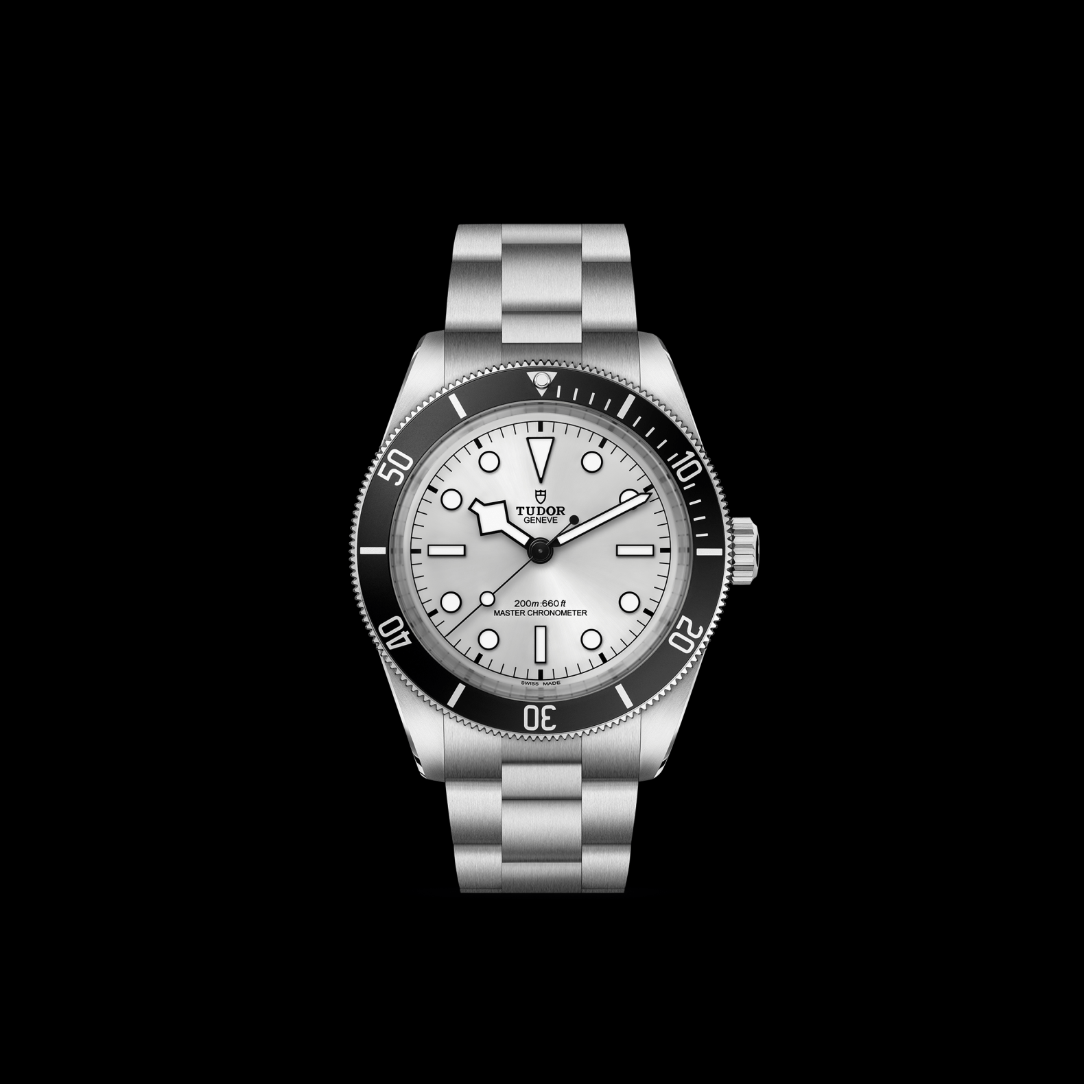 TUDOR Black Bay M7943A1A0NU-0002 Caja de 43 mm de acero inoxidable, acabados pulidos y satinados, Bisel unidireccional 60 minutos de acero inoxidable con disco de aluminio negro mate, Calibre de Manufactura MT5601-U (Certificado por el COSC y METAS) Movimiento mecánico de cuerda automática con rotor bidireccional, Corona a rosca de acero inoxidable con la rosa de TUDOR en relieve, Hermético hasta 200 m, Brazalete de acero inoxidable de 3 eslabones, con flancos lisos y acabados pulido y satinado con el cierre de TUDOR «T‑fit»