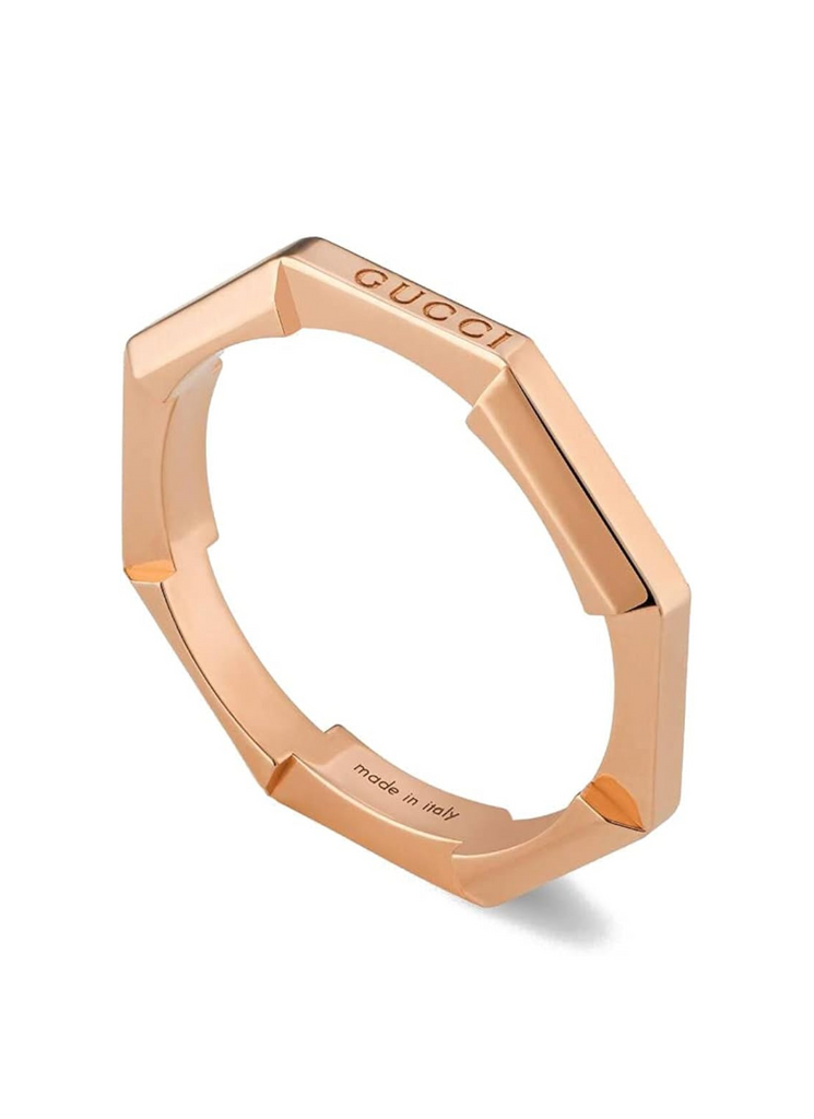 La colección Link to Love de Gucci es una exploración del romance moderno que caracteriza a los nuevos símbolos del amor. La colección combina diferentes tonos de oro y una mezcla de acabados que fusionan las líneas entre lo masculino y lo femenino. Cada pieza está pensada para inspirar formas individualizadas de llevarlas con elementos apilables y en capas. Este anillo de oro rosa de 18 quilates con espejo tiene un mecanismo apilable.