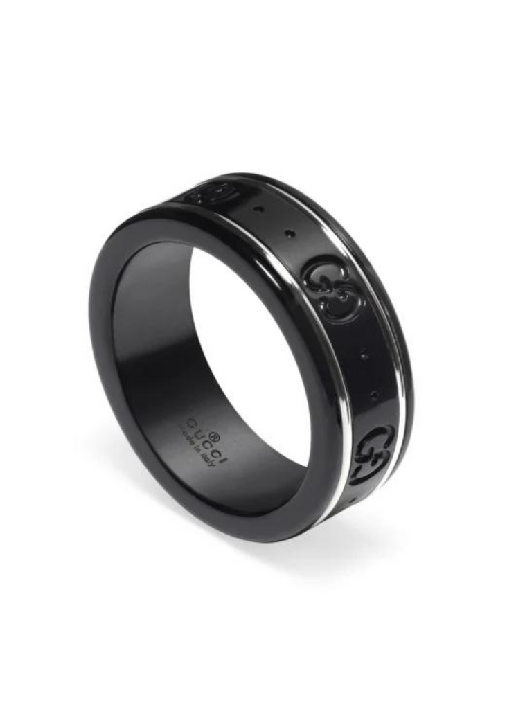 El emblemático motivo GG está grabado en un anillo de corindón sintético negro, enriquecido con detalles de oro blanco de 18 k para un contraste sutil.