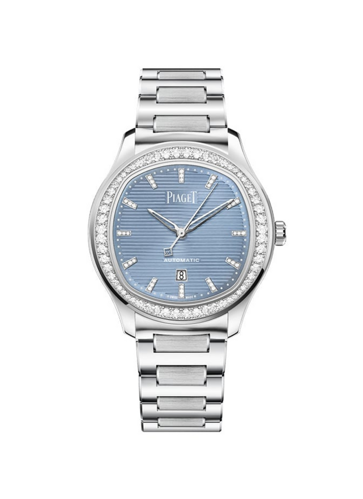Reloj Piaget Polo Date de 36 mm. Caja de acero con 60 diamantes talla brillante (aprox. 0,97 ct). Esfera plateada azul pizarra con 36 diamantes talla brillante (aprox. 0,08 ct). Fondo de cristal de zafiro. Correa intercambiable. Movimiento mecánico automático de manufactura 500P1.