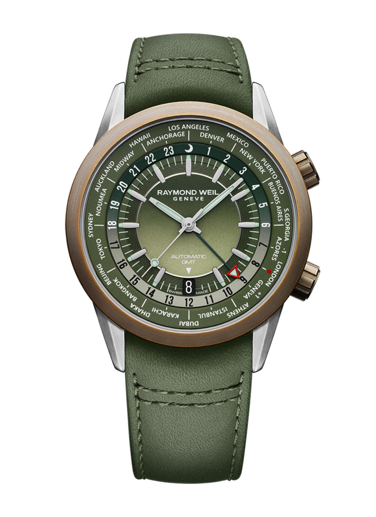 Con sus 40,5 mm de diámetro y un grosor de sólo 9,7 mm, RAYMOND WEIL ha realizado una exitosa labor relojera con el reloj independiente GMT Worldtimer, ofreciendo así un mecanismo complejo enclavado en un modelo lleno de delicadeza.