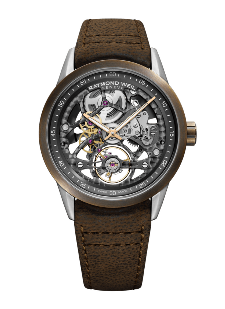 El último reloj independiente Calibre RW1212 esqueleto de RAYMOND WEIL combina un material noble del pasado y el conocimiento suizo de precisión de hoy.