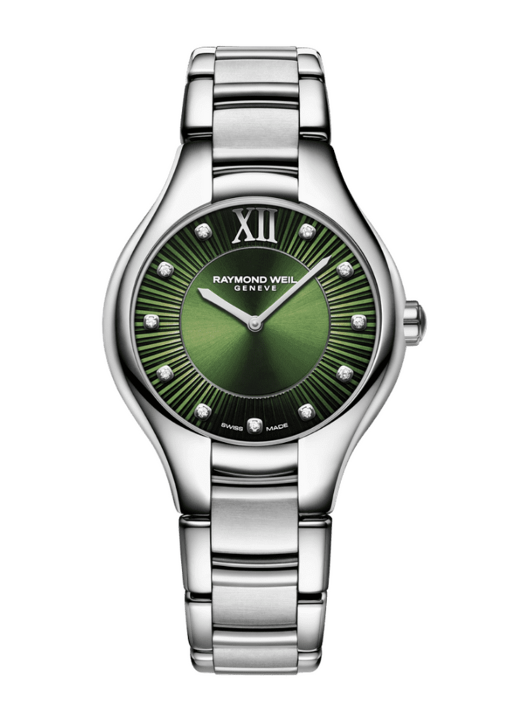 Este delicado modelo de acero inoxidable presenta una caja de 32 mm y una esfera verde sutilmente elaborada. Su esfera está adornada con 11 índices de diamantes y un índice XII en números romanos, en referencia a modelos anteriores de la colección. La corona está adornada con una cúpula lacada en azul medianoche. Esta creación armoniosa es una oda al estilo refinado y la gracia femenina.