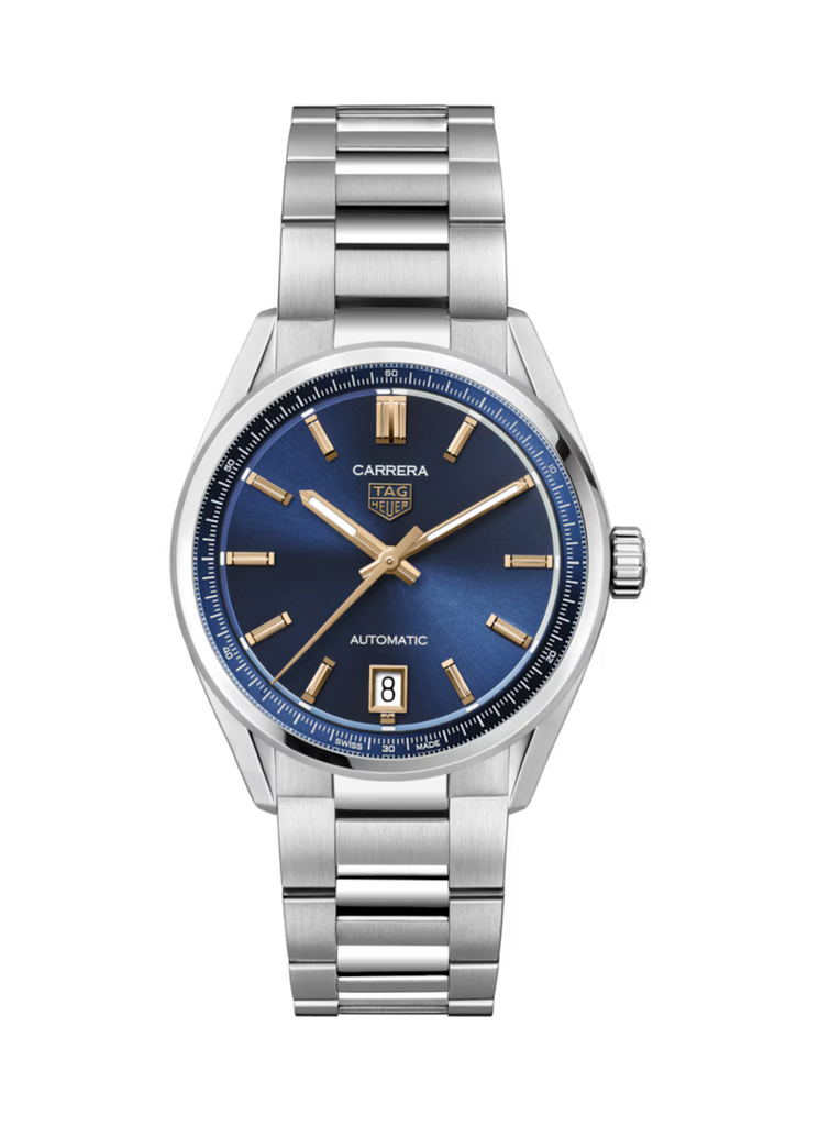 Este TAG Heuer Carrera exhibe con orgullo su atractivo característico gracias a su llamativa esfera azul intenso satinada con efecto "rayos de sol" que contrasta con sus agujas e índices aplicados y chapados en oro rosa (18 qt 5N). Equipado con el movimiento Calibre 7, está decidido a superarse.