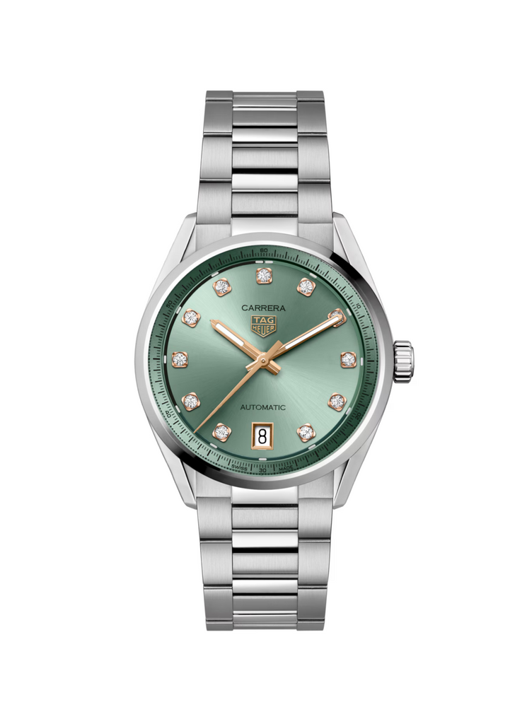 Presentamos el TAG Heuer Carrera Date, con una caja de acero de 36 mm y una esfera verde satinada con efecto rayos de sol. Este reloj redefine la sofisticación moderna. La esfera, de un sutil verde pastel, está engastada con 11 diamantes VS de 0,22 ct que aportan un brillo sutil, complementados con detalles chapados en oro rosa para una apariencia refinada.